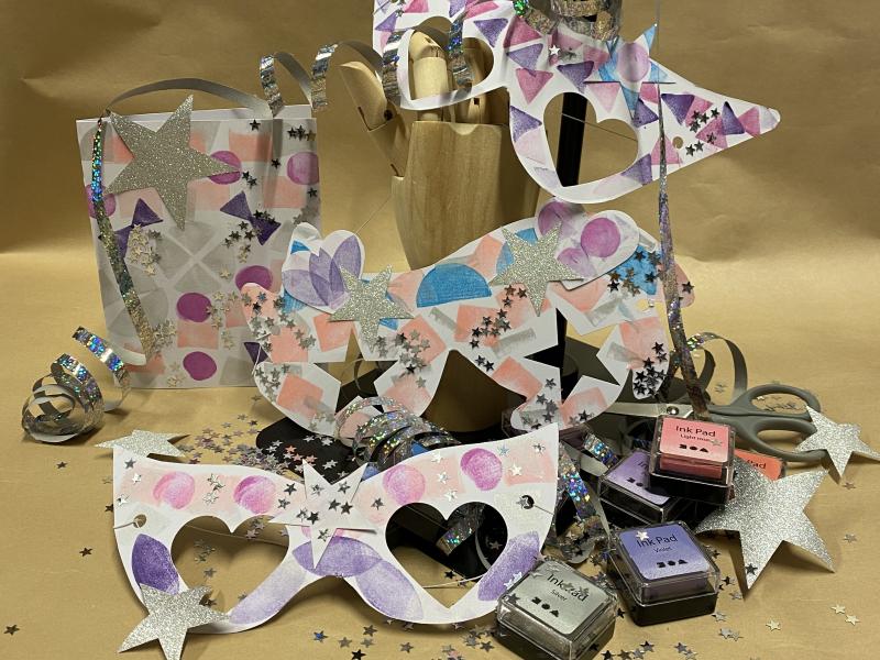 Kom og lav dine egne nytårskortkort og nytårsmasker og pynt med stempler og glimmer.